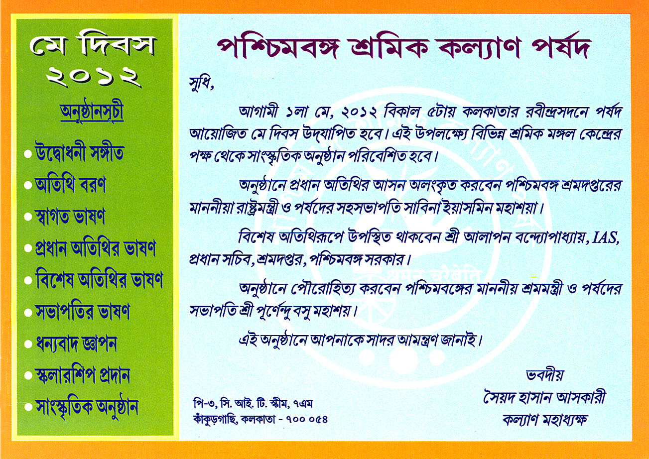 | Celebration of May Day by West Bengal Labour Welfare Board at Rabindra Sadan, Kolkata on 01.05.2012 (Tuesday) at 5.00 PM.