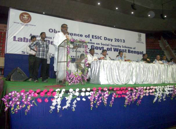 Every year 24th day of February is observed as E.S.I. day. This year at the instance of Labour Department, Government of West Bengal the day was observed in a different way. This year, the State Level Programme was organized jointly by the State Government and E.S.I. Corporation at Durgapur on 24/02/2013. The occasion presented an opportunity for generation of awareness about various Social Security Schemes of the Labour Department, Government of West Bengal. The West Bengal Labour Welfare Board was also called upon to participate in the programme. The programme was graced by the presence of Hon'ble Minister-in-Charge, Labour Department, Government of West Bengal, Shri Purnendu Basu who addressed a packed auditorium in the Indoor Stadium, Durgapur and explained at length the steps taken by the Labour Department, Government of West Bengal towards Social Security of workers and also expressed his expectation from the E.S.I. Corporation regarding Medical Facilities. Stalls were set up in the venue by different departments including the West Bengal Labour Welfare Board to demonstrate the activities carried out for the welfare of the working people.
