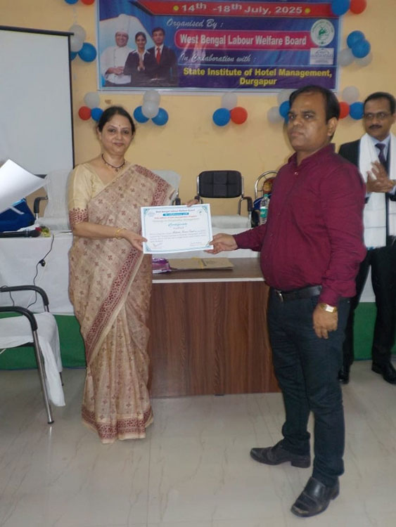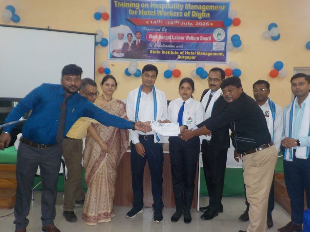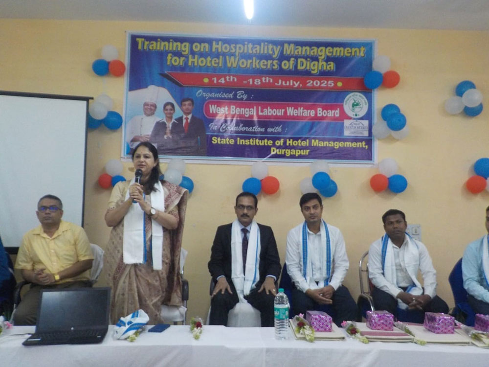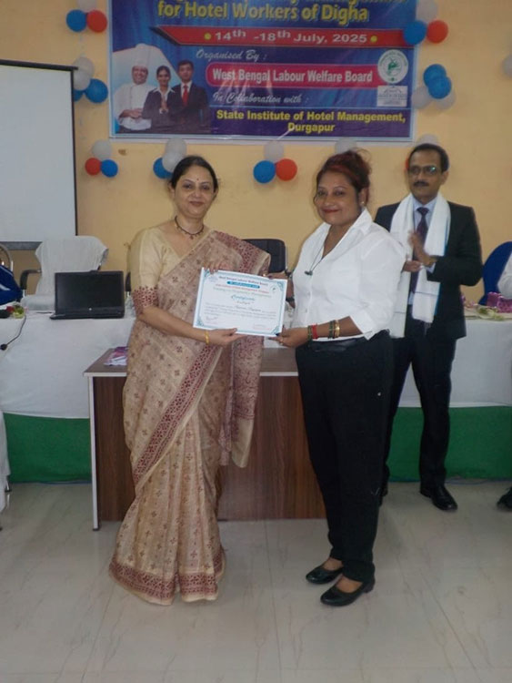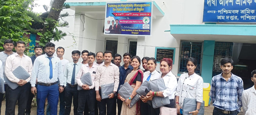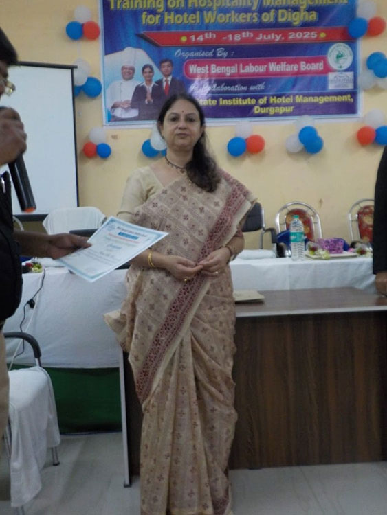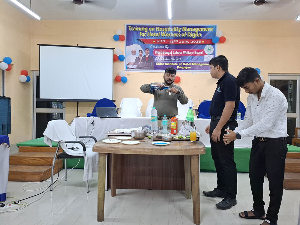Moments of training programme on Hotel Management organised by West 'Bengal Labour Welfare Board in collaboration with State institute of Hotel Management, Durgapur held from 14th july to 18th july 2025 at Digha Labour Welfare Centre. JLC (P) Haldia, OC, Digha P.S. and other officials were present on the inaugural day of the programme. The trainers and officials of State institute of Hotel Management, Durgapur taught the incumbents about various types of Hospitality Management works during this 5 days workshop. Sumita Mukherjee, Hon'ble Welfare Commissioner, West Bengal, Debu Kar, Deputy Welfare Commissioner and other Officials were present on the last day of the programme. The Hon'ble Welfare Commissioner gave a valuable valediction lecture for the participants and briefed the media personnel about the objectives and importance of the workshop in the closing ceremony of the training programme. Overall, this training programme was applauded by the participants as an effective one as well as immensely helpful for them and it got wide media coverage. total 25 no of trainees participated in the programme